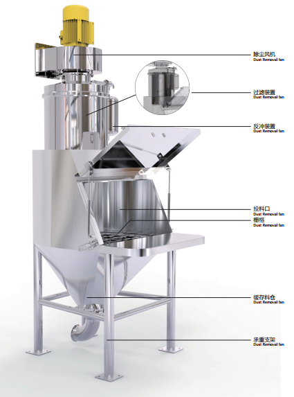 它通過人工拆袋自動傾倒等步驟使物料靠重力落進貯料斗中來完成拆袋卸料工作。該設備內部安裝過濾器清潔裝置及排風扇,用于將傾倒過程中產生的粉塵濾除,并將潔凈尾氣排入大氣,使人工能在清潔的環境中輕松地工作。